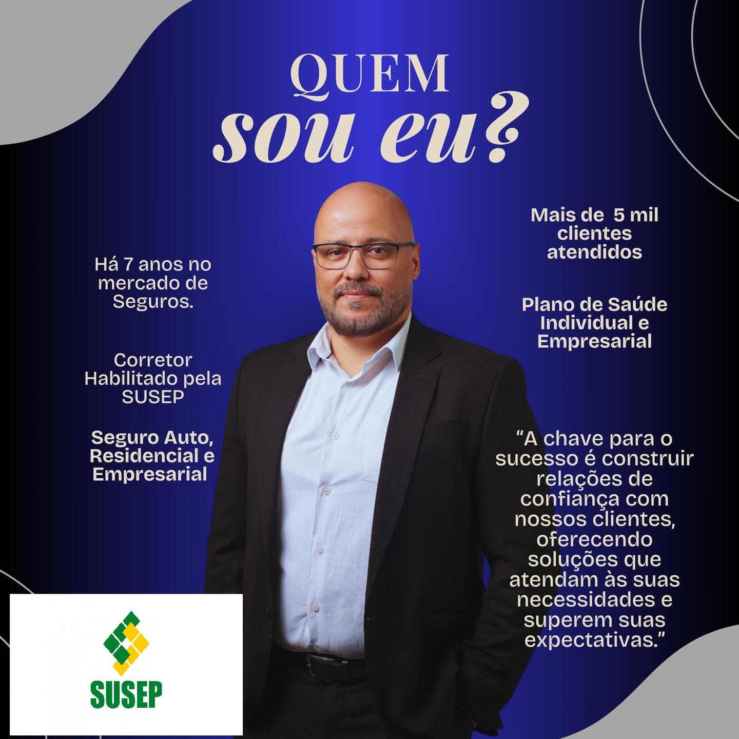 Somos especialistas em criar soluções personalizadas que protegem o que você mais valoriza. Com uma equipe experiente e dedicada, oferecemos uma ampla gama de seguros, incluindo planos de saúde, automóvel, vida, empresarial e residencial. Nos comprometemos a garantir a segurança e a tranquilidade dos nossos clientes, proporcionando um atendimento de excelência e consultoria especializada, para que você tome as melhores decisões. Venha nos conhecer e descubra como podemos ajudar a proteger sua vida e seus bens com confiança e eficiência."